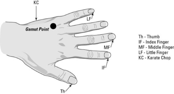 9. The center of the fleshy part of the outside of your hand (either hand) between the top of the wrist and the base of the baby finger. This is called the Karate Chop point.
